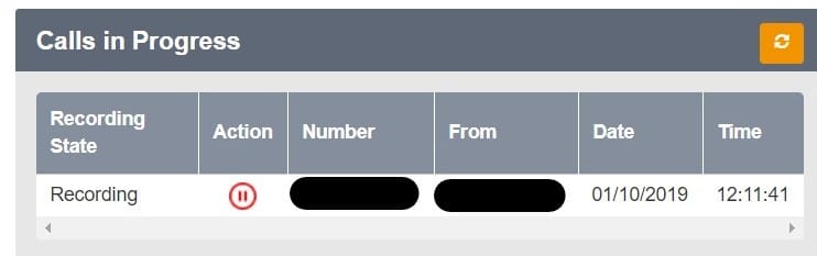 - Under the calls in progress, you should be able to see your current call that is in progress and a pause button, similar to the below. Simply click the pause button to pause and click the play button to resume. If you have the ability you can stop call recording for all future calls using the square stop button.