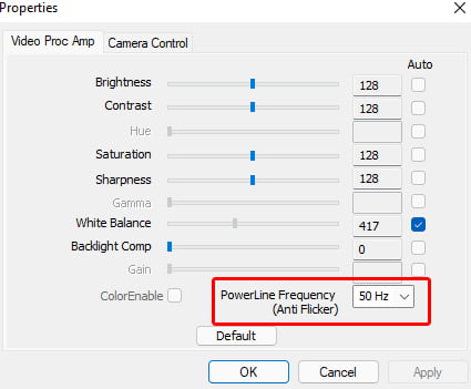 3. In the bottom right corner open the dropdown box labelled ‘PowerLine Frequency (Anti Flicker) – choose the appropriate option (if you live in the UK it will be 50Hz)